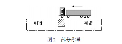 整車稱量是承載器支撐一輛車輛的整體進行稱量得到車輛總質量的稱量方式,如圖1所示,前后兩側為引道,斜線框為動態地磅的承載器,能夠同時支撐車輛的整體。部分稱量是在同一承載器上對一整輛車進行兩次或兩次以上的稱量,稱量后可將每部分(如軸載荷)稱量結果相加,得到車輛總質量的稱量方式,如圖2所示,承載器只能同時支撐車輛的一個軸。