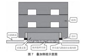 通過最終組合疊加的方式,再根據實際稱量要求加載至所需砝碼量。由于拱形砝碼扣在砝碼支架上,其伸展部分與地面脫離并不接觸,且脫離地面高度也僅約2.5 cm,當加載不穩可能出現傾斜時,兩邊伸展部分也可起到一定緩沖支撐的作用。疊加側視圖,如圖7所示。