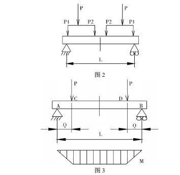 在圖 2 中:P 為過(guò)衡汽車輪胎施加給秤臺(tái)的重力,P1 與 P2 則分別是秤臺(tái)施加給橫梁的作用力,實(shí)際上其作用力我們可以看成是一條簡(jiǎn)支梁,如圖 3 所示,從附圖中可以看出,該橫梁最大彎矩處在 C- D 段,