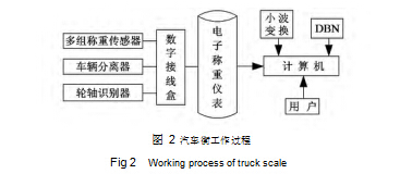 整車式動態地磅工作流程如圖 2,當車輛經過動態地磅時,車輛分離器、輪軸識別器和多組稱重傳感器采集信號,將采集到的信號經由數字接線盒傳到電子稱重儀表,電子稱重儀表將信號上傳給計算機,計算機通過小波變換和 DBN 對故障的傳感器進行判斷并預測出正常情況下信號的估計值,取代故障值,從而為動態稱重系統提供較準確的輸出。